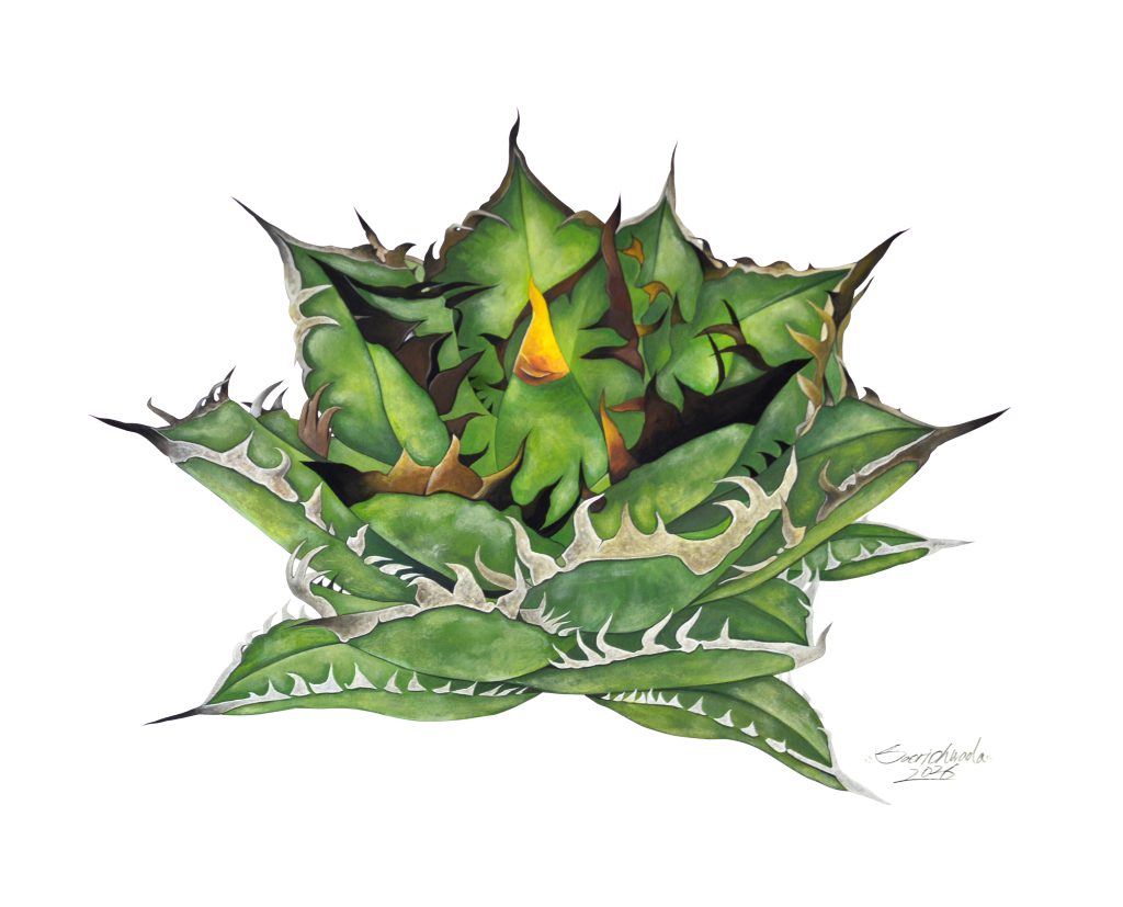 今から約10年前、植物を育て始めたことをきっかけに、多肉植物が持つ独特な造形や色彩に魅了され、珍しい植物をメインモチーフとした作品を制作を始めました。自宅では約200株を超える多肉植物やサボテンを自ら育てており、日々の水やりや観察を通じ、季節とともに変化する植物の生命力を肌で感じることで、写真では捉えきれない植物の美しさや逞しさを作品に込め、その力強い生命力を私というフィルターを通し表現し続けています。本展では、私が日々愛でている多肉植物たちをモチーフに描いた作品となっており、生命の輝きや美しさを間近で感じていただければ幸いです。